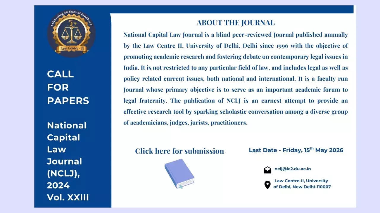 National Capital Law Journal is a blind peer-reviewed Journal published annually by the Law Centre II, University of Delhi, Delhi since 1996 with the objective of promoting academic research and fostering debate on contemporary legal issues in India. It is not restricted to any particular field of law, and includes legal as well as policy related current issues, both national and international. It is a faculty run Journal whose primary objective is to serve as an important academic forum to legal fraternity. The publication of NCLJ is an earnest attempt to provide an effective research tool by sparking scholastic conversation among a diverse group of academicians, judges, jurists, practitioners.