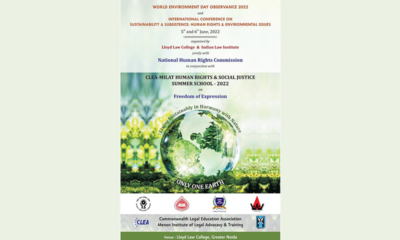 TheInternational Conference is being organized by theNational Human Right Commission (NHRC), New Delhi in association with Indian Law Institute (ILI), New Delhi and Lloyd Law College, Greater Noida,and with academic support from Empowerment through Law of the Common People (ELCOP), Bangladesh,is organisingWORLD ENVIRONMENT DAY OBSERVANCE 2022 and INTERNATIONAL CONFERENCE ON SUSTAINABILITY & SUBSISTENCE: HUMAN RIGHTS & ENVIRONMENTAL ISSUES" from 5th June to 6th June, 2022 in conjunction with the CLEA‐MILATHUMAN RIGHTS & SOCIAL JUSTICE SUMMER SCHOOL- 2022.