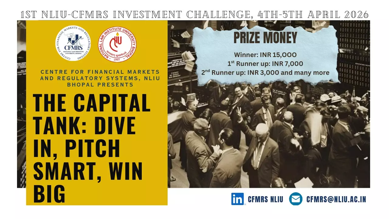 The Centre for Financial Markets and Regulatory Systems (CFMRS) at the National Law Institute University, Bhopal has announced, “The Capital Tank: 1st NLIU–CFMRS Investment Challenge, 2026”, scheduled to be held on 4th and 5th April 2026 at the NLIU Bhopal campus. The competition warmly invites students, professionals, academicians, and practitioners from diverse backgrounds, including law, management, finance, and public policy, to participate in this unique investment simulation. Participants will step into the role of startup founders, develop investment and funding strategies, and pitch their ideas before a distinguished panel of experts from law, finance, investment, and academia.