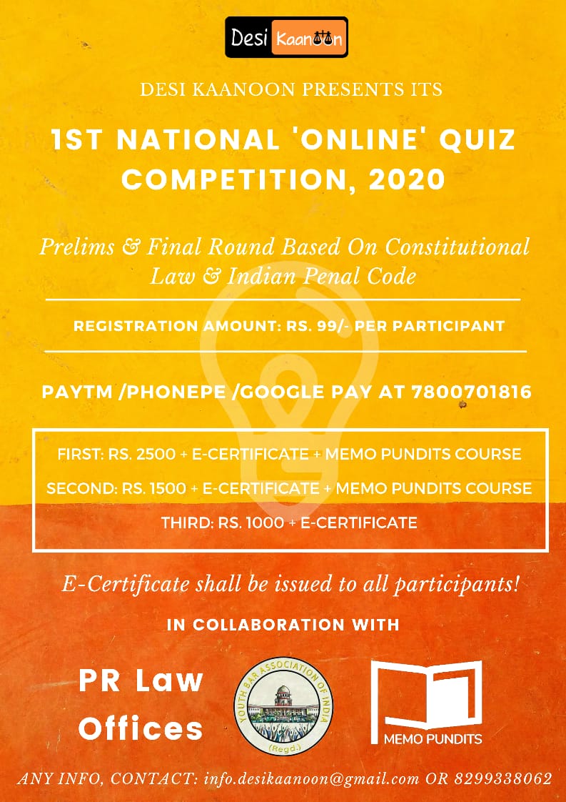 Desi Kaanoon, a social-media start-up by law students, for law students, is organising the first National Online Quiz Competition, 2020.