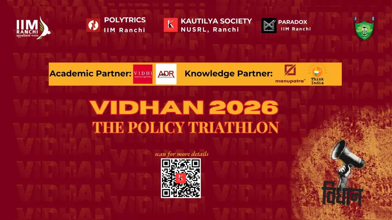 The National University of Study and Research in Law (NUSRL), Ranchi, in collaboration with the Indian Institute of Management (IIM) Ranchi, has announced the Second Edition of “Vidhan – The Policy Triathlon”, a national-level public policy competition aimed at fostering interdisciplinary engagement with governance, law, economics, and public administration.