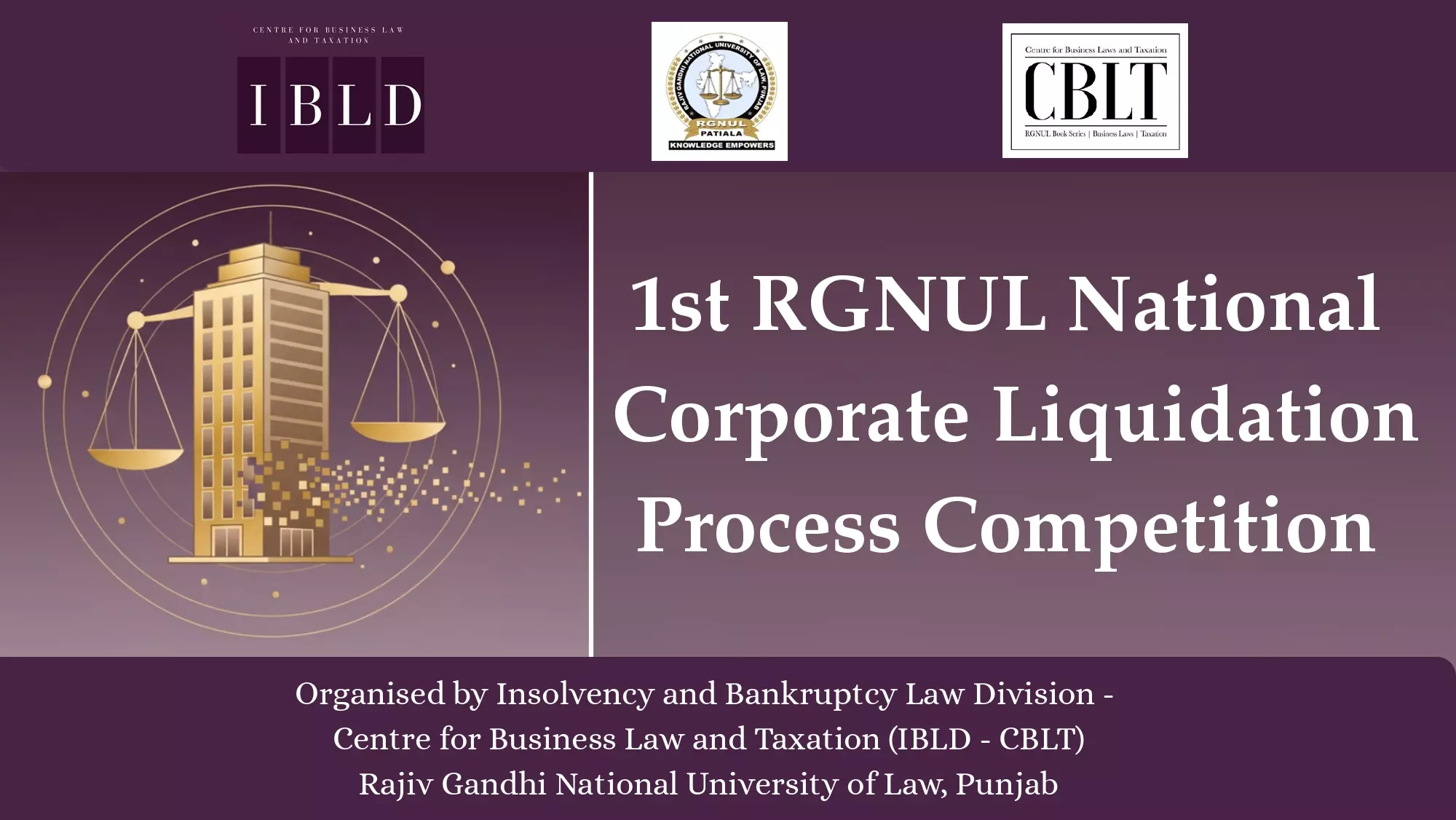 The 1st RGNUL National Corporate Liquidation Process Competition is a flagship academic initiative organised by the Insolvency and Bankruptcy Law Division (IBLD) under the Centre for Business Laws and Taxation (CBLT), Rajiv Gandhi National University of Law, Punjab. Conceived as a practice-oriented competition, it seeks to familiarise law students with the end-to-end corporate liquidation mechanism under the Insolvency and Bankruptcy Code, 2016, moving beyond conventional moot formats to reflect the real statutory and commercial responsibilities of a Liquidator.