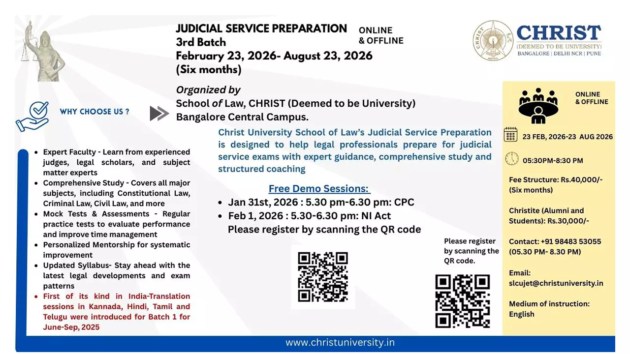 The School of Law, CHRIST University, announces Batch–3 of its Judicial Service Preparation Programme, to be conducted in online and offline modes. The programme is designed not only for judicial service aspirants but also for candidates preparing for recruitment interviews and other competitive examinations in the field of law.insights for facing recruitment interviews and other competitive examinations in the field of law.