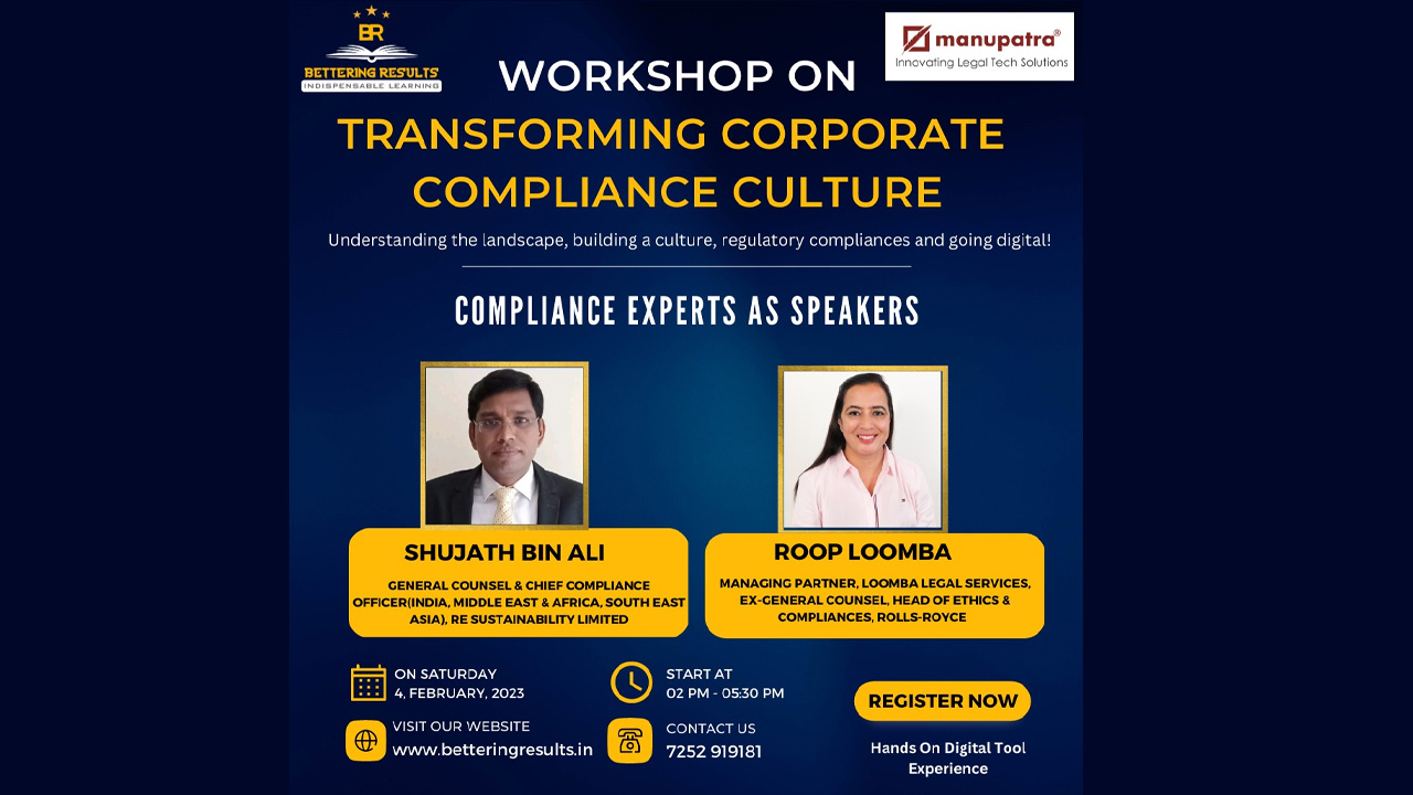 To further your knowledge of compliance, and to help you develop a culture of compliance in your own organisation, Bettering Results and Manupatra invite you to an Online Workshop on Transforming Corporate Compliance Culture.