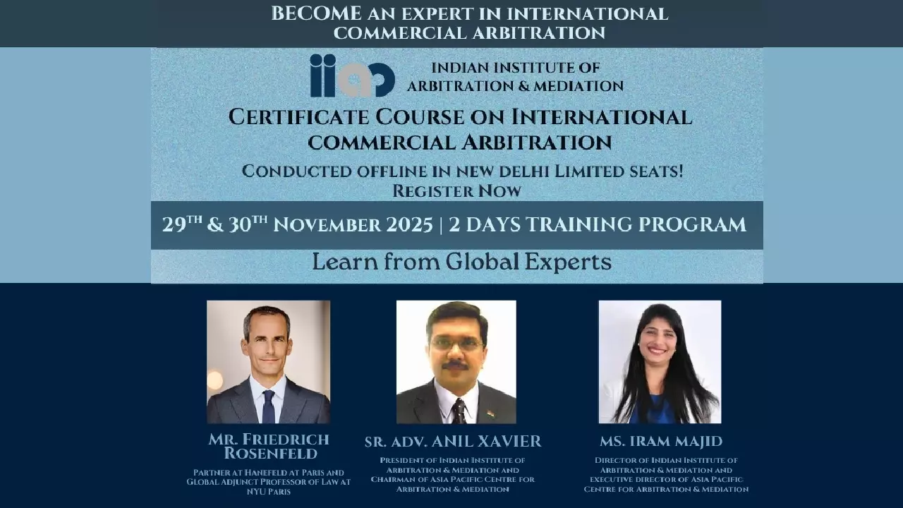 The Indian Institute of Arbitration & Mediation (IIAM) has announced the registration opening for a comprehensive two-day, offline “Certificate Course on International Commercial Arbitration,” scheduled to be held on 29th and 30th November 2025 in New Delhi. This program aims to equip legal professionals and practitioners with both knowledge and practical expertise in the field of International Commercial Arbitration (ICA) — a vital dispute resolution mechanism in a globalized commercial environment. Participants who complete the training will have the opportunity to become Certified Commercial Arbitrators with international accreditation.