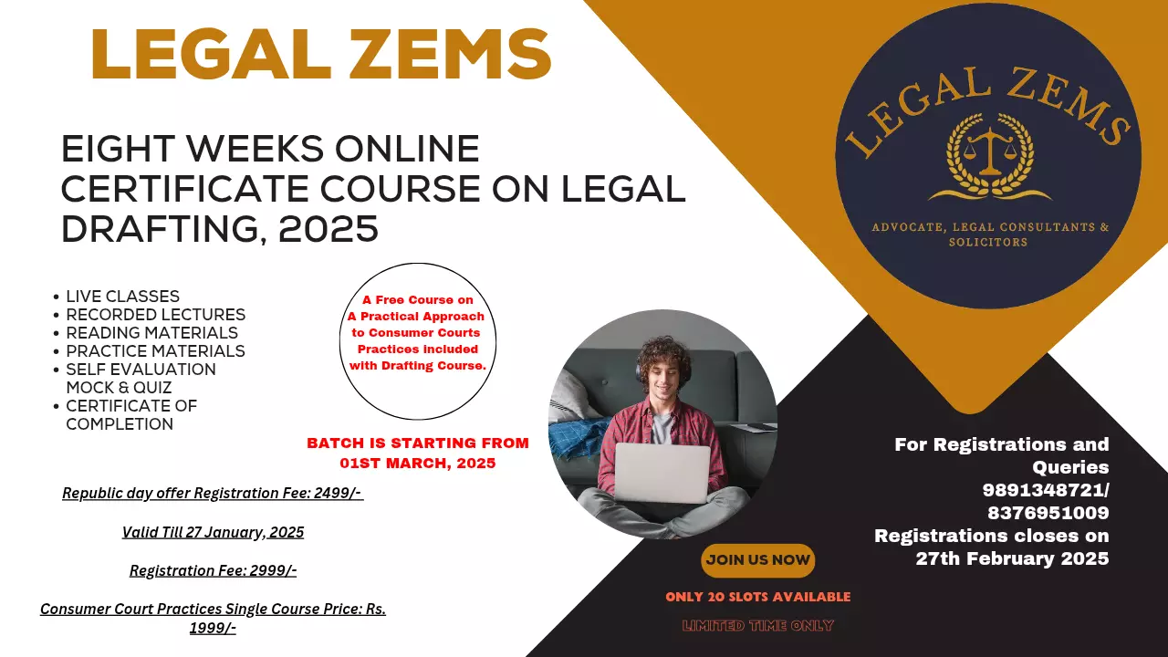 Legal Zems, a distinguished litigation-focused law firm, boasts has a legacy of over Five Years in the legal arena. Legal Zems has announced commencement of 8 Weeks Live Online Certificate Course on Legal Drafting, 2025 along with free course on A practical Approach to Consumer Court Practices.