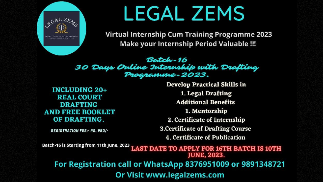 Legal Zems: 16th Batch Online Internship With Drafting Programme 2023 [11th June- 11th July, 2023]