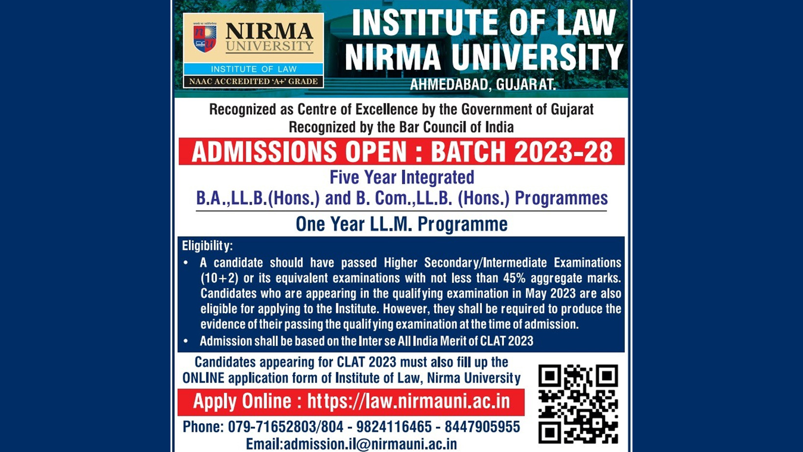 Apply online: http://law.nirmauni.ac.in