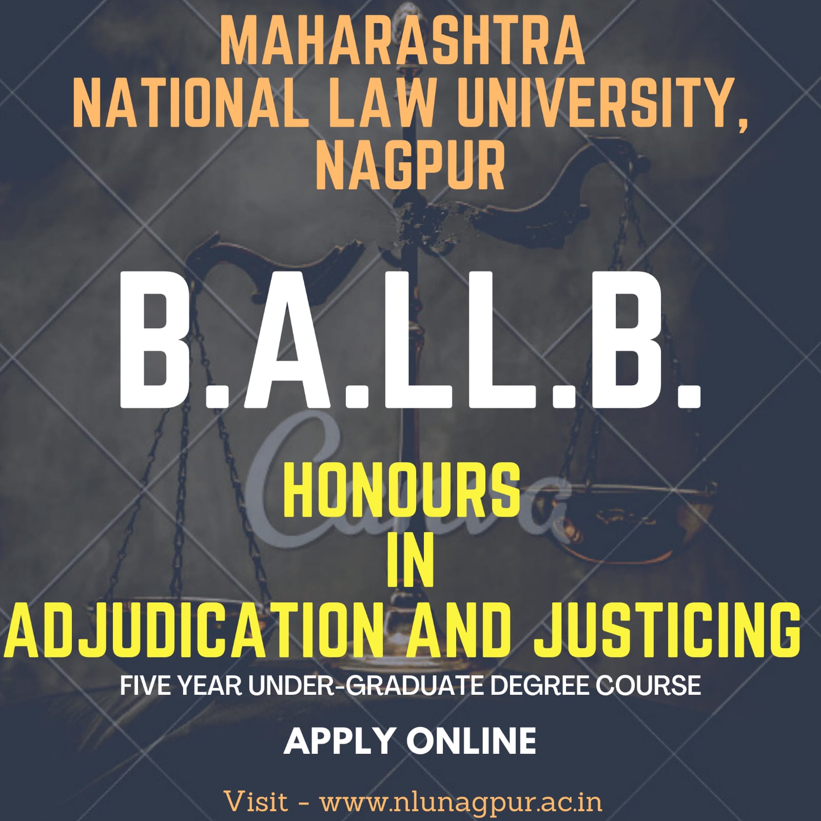 Maharashtra National Law University, Nagpur invites candidates for admission in B.A.LL.B. (Honours in Adjudication and Justicing), an Undergraduate Degree Course. This Five-Year duration degree course comprises of intensive and exhaustive practical training with regular Internships and Judicial Clerkship and Six months of Apprenticeship (Semester-X) under the guardianship of High Court Justices and District Judges. B.A.LL.B. (Honours in Adjudication and Justicing) is a residential Degree Course that aims to equip the students with critical legal thinking for entry level of Judiciary. Its curriculum focuses on pluralism, social integration, and socio-cultural structure of the State
