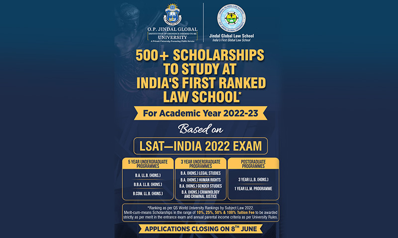 He concluded by saying that "every student whose annual parental income is less than INR 30 lakhs must explore the scholarship opportunities to study at JGLS. Also, no law aspirant should miss taking the prestigious LSAT--India 2022 Test organised by Law School Admission Council (LSAC) as this Test is critical not only for admission but also for scholarships at the law school. Scholarships at the time of admission are important as one may receive it for all 5/3 years of study. The scholarships at JGLS are subject to University Rules and renewable every year based on academic performance, they can be revoked or reduced if students fail in the exams or debarred from the examination due to attendance shortage or found guilty in disciplinary committee proceedings."