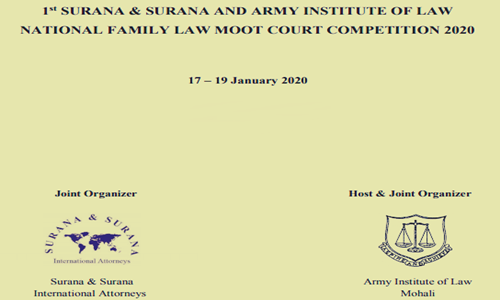 The Army Institute of Law is privileged to announce the 1st Surana and Surana and Army Institute of Law National Family Law Moot Court Competition 2020 to be hosted by the Army Institute of Law in collaboration with Surana & Surana International Attorneys, from 17th January to 19th January 2020.