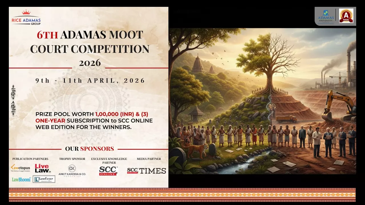 The 6th Adamas Moot Court Competition, 2026 is a national-level moot court competition organized by the School of Law and Justice at Adamas University. The competition aims to provide law students with a platform to develop and demonstrate their skills in legal research, memorial drafting, and oral advocacy through simulated court proceedings. By engaging with complex contemporary legal issues, the event encourages participants to critically analyze constitutional, environmental, and socio-economic dimensions of law.
