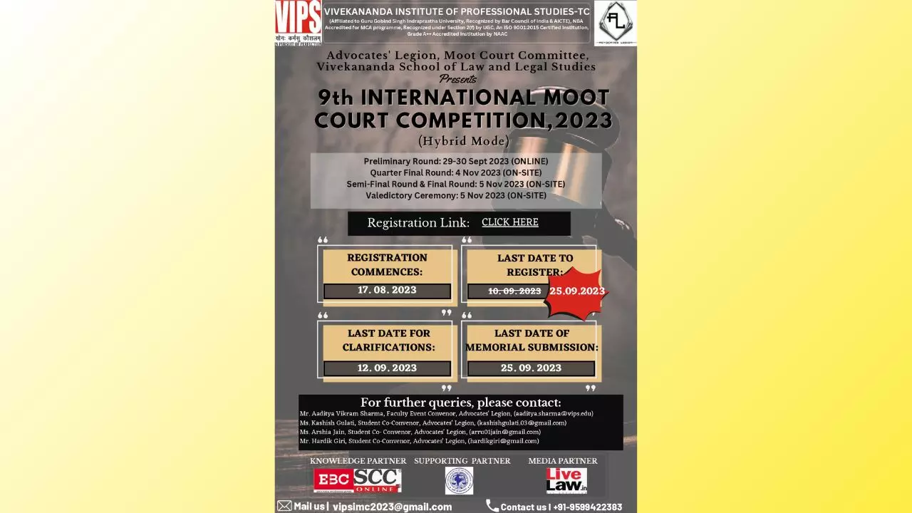 Advocates’ Legion, Moot Court Committee, Vivekananda School of Law and Legal Studies, Vivekananda Institute of Professional Studies-Technical Campus, New Delhi (VSLLS, VIPS-TC), proudly announces the 9th edition of its International Moot Court Competition, 2023. This year, the problem covers international human rights law, private military companies, and State Responsibility. The event will take place in a hybrid manner, with the preliminary rounds being held online and the quarter-finals and onwards on our campus in New Delhi. LiveLaw is the Media Partner of this year's VIPS IMC, and EBC and SCC Online are the knowledge partners. You are invited to participate in this year’s flagship event of our Moot Court Society!