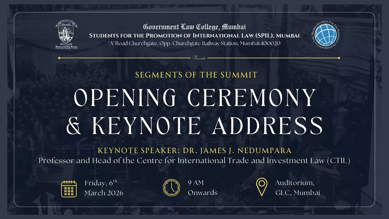The Students for the Promotion of International Law (SPIL), Mumbai, at the Government Law College, Mumbai invites audience to the Opening Ceremony and a Keynote Address by Dr. James J. Nedumpara, Professor & Head, CTIL New Delhi, as part of the 16th GLC International Law Summit 2026 sponsored by Rungta Steel, scheduled to be held on 6th March 2026 at the Government Law College, Mumbai.