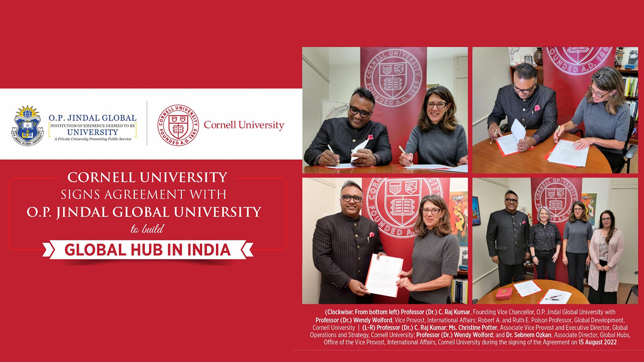 World class Ivy League Institute, Cornell University, U.S.A and Institution of Eminence, O.P. Jindal Global University, Sonipat, have entered into a Memorandum of Agreement whereby the latter would be working with Cornell as one of its centres for Cornell Global Hub, in a bid to enable both the institutions to build substantive partnerships and collaborations across all of its schools and programmes.
