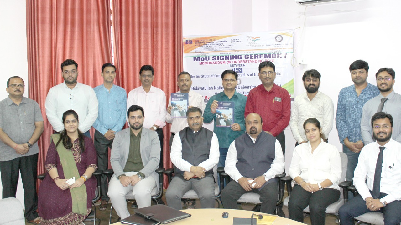 The Hidayatullah National Law University (HNLU), Raipur signed a Memorandum of Understanding (MoU) for academic collaboration with Institute of Company Secretaries of India (ICSI) in a function held at HNLU on Tuesday, 14 June 2022.