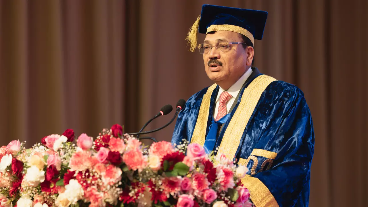 Addressing the graduating class, the Vice Chancellor reflected that law, at its finest, is not spectacle but dignity restored. He identified five markers of HNLU's recent progress: recognition from academic and professional peers; the blooming Research Hub & Spoke (R-HaS) model; significant infrastructure investments; faculty achievements; and student accomplishments. He further remarked that while legal education involves absorbing accumulated wisdom and practice, its true purpose lies in the imagination and renewal of that wisdom.