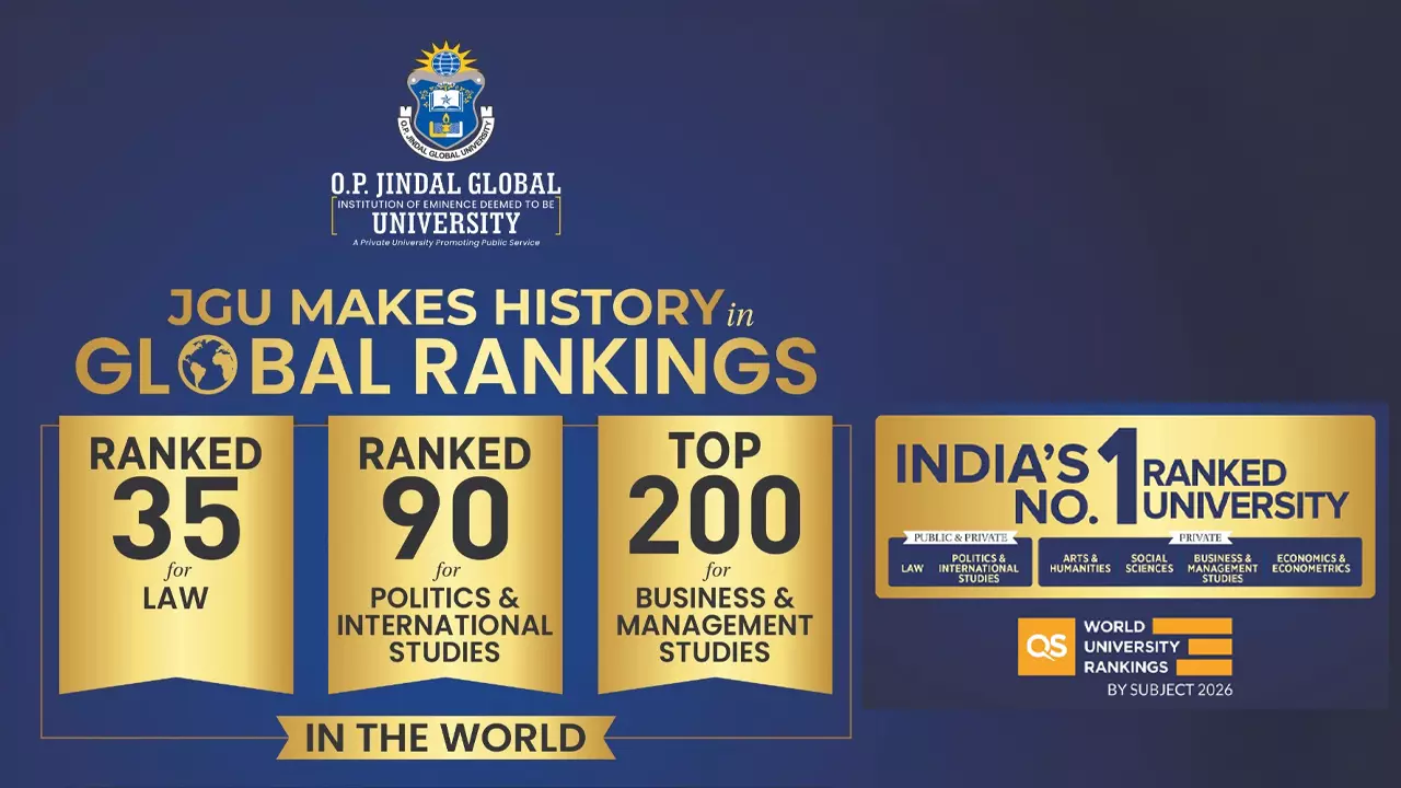 In Law & Legal Studies, JGU has been ranked #35 globally, improving from #78 in 2025, and has been ranked #1 in India for the seventh consecutive year.