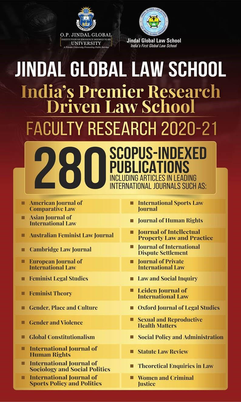 "It is important to put these numbers in perspective. There are 23 National Law Universities (NLUs) in India. The first Indian NLU on this list is 35 years old and the top four/five NLUs were established in the 1980s and the 1990s. An analysis of the SCOPUS database managed by Elsevier publishing house reveals that, for the same period, Jindal Global Law School's record 280 Scopus-indexed publications are twice the number of Scopus-indexed publications listed by all the 23 NLUs combined. On average, one NLU can be credited with 6 SCOPUS publications in 2020-21."