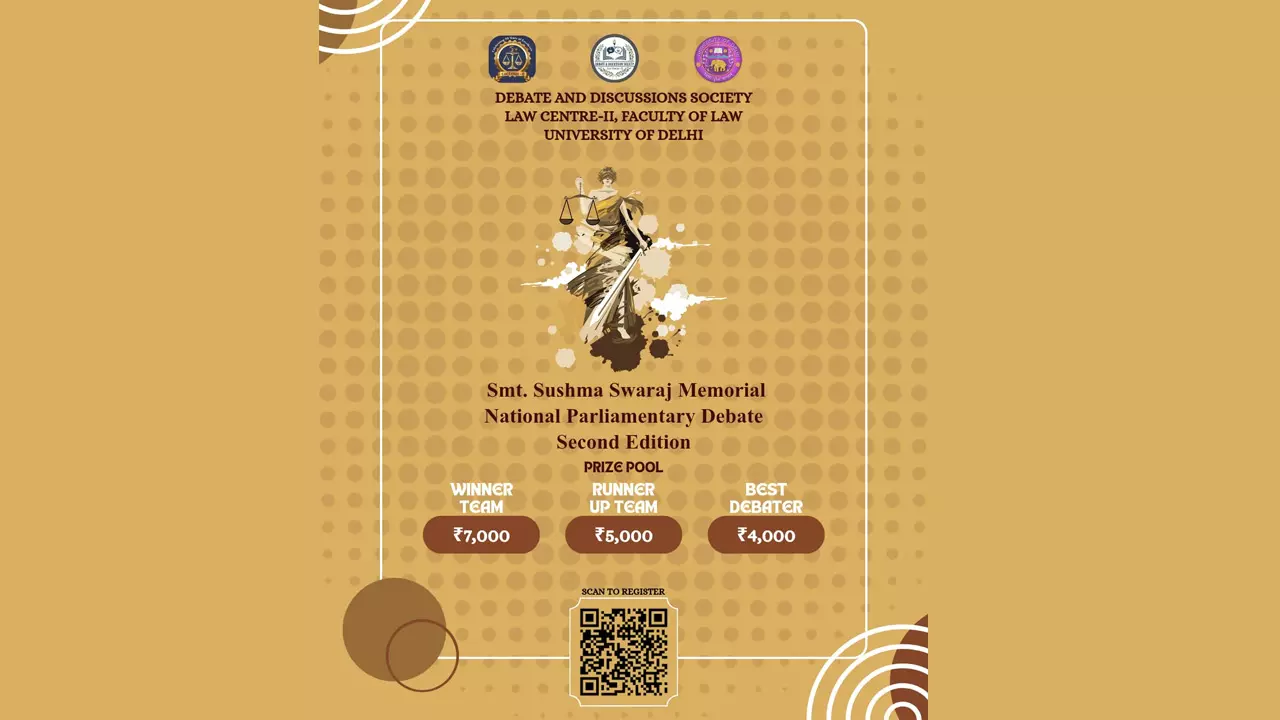 Law Centre II, University of Delhi, through its Debate and Discussion Society, Law Centre II, has announced the Second Edition of the Smt. Sushma Swaraj Memorial National Parliamentary Debate, scheduled to be held on 5-6 April, 2026 at Umang Bhawan, Faculty of Law, University of Delhi.