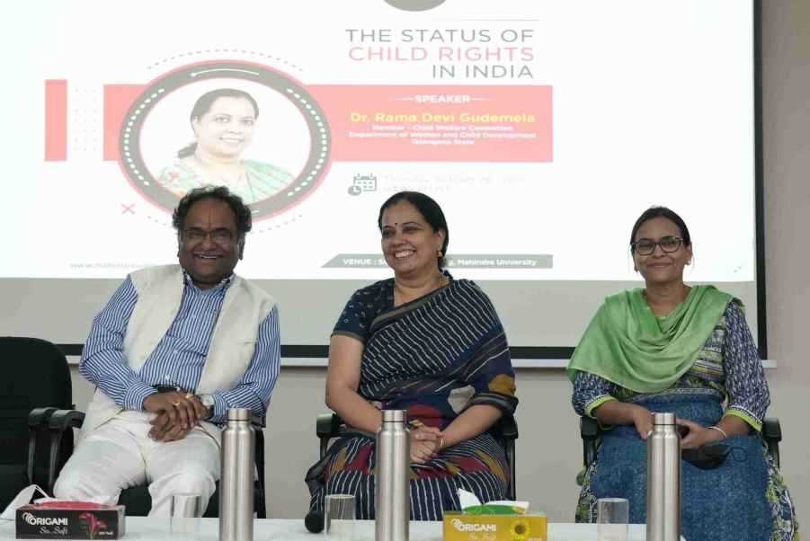Mahindra University School of Law organized a lecture on "The Status of Child Rights in India", as part of its lecture series to familiarize students with different aspects of the legal system in India. Dr. Rama Devi Gudemela, Member Child Welfare Committee, Department of Women and Child Development, Telangana State, delivered an enlightening session on the subject.