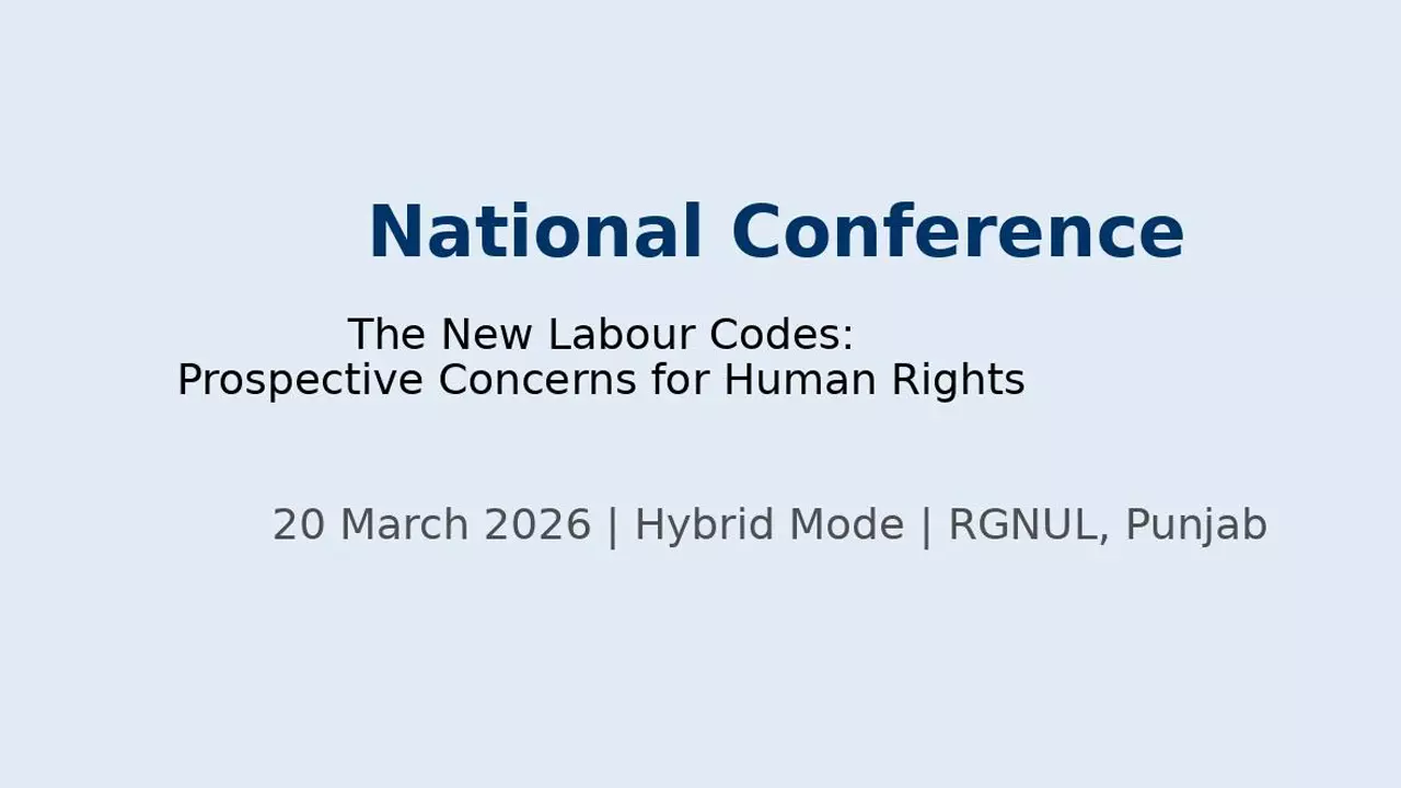 Rajiv Gandhi National University of Law (RGNUL), Punjab, through its Centre for Advanced Studies in Labour Welfare (CASLW) and Centre for Advanced Studies in Human Rights (CASIHR), is organising a One-Day National Conference titled “The New Labour Codes: Prospective Concerns for Human Rights” on 20 March 2026 in hybrid mode.