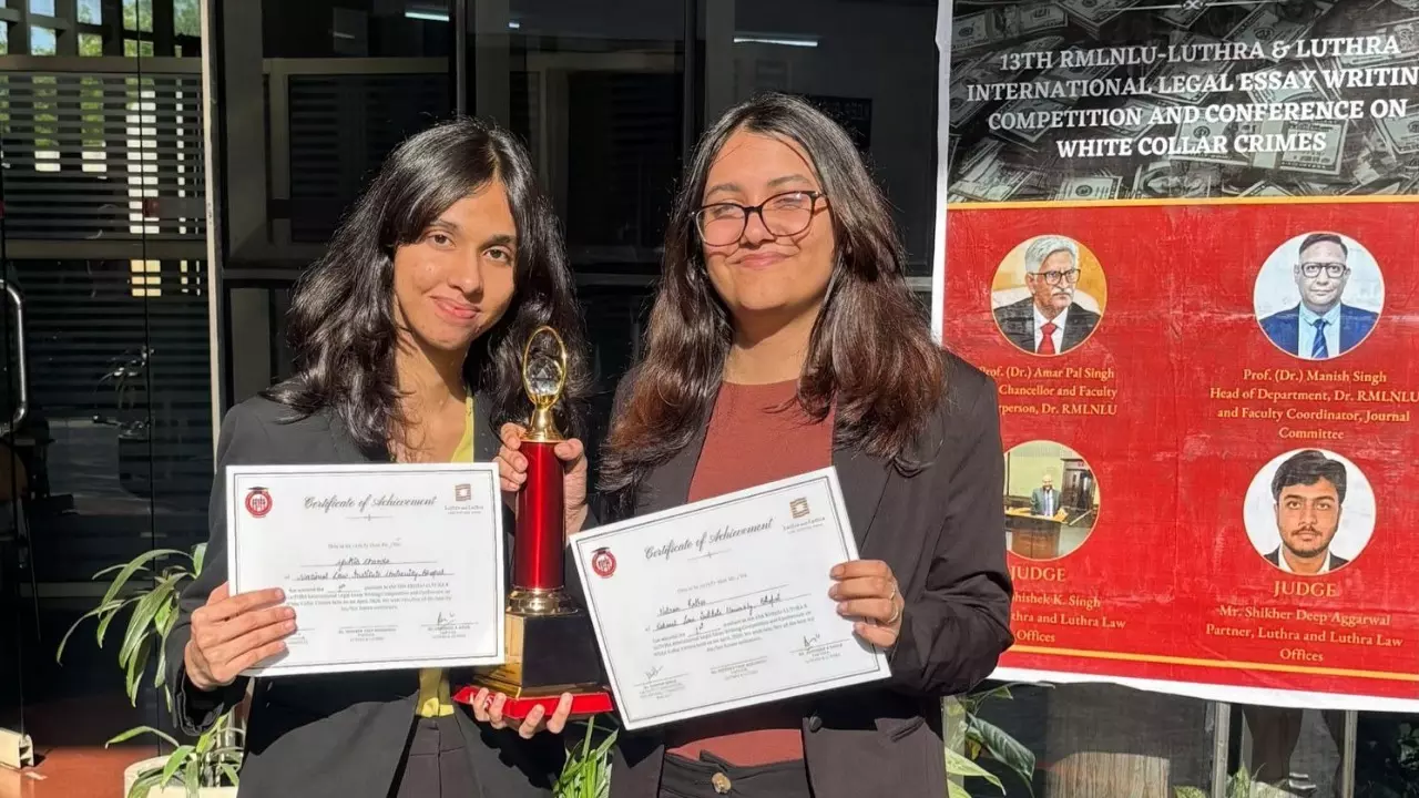 Yukta Chanda and Netraa Rathee, third-year students of National Law Institute University (NLIU), Bhopal, have been declared winners of the 13th RMLNLU–Luthra & Luthra International Legal Essay Writing Competition and Conference on White Collar Crimes held at Dr. Ram Manohar Lohiya National Law University, Lucknow.