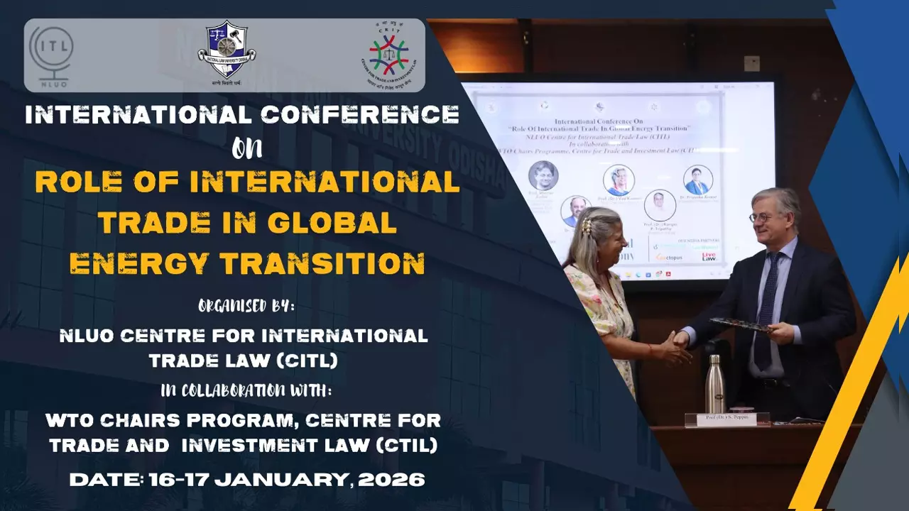 The National Law University Odisha concluded its l two-day International Conference on the “Role of International Trade in Global Energy Transition” on 17 January 2026 at its Cuttack campus. Organized by the NLUO Centre for International Trade Law (CITL) in prestigious collaboration with the WTO Chairs Programme and the Centre for Trade and Investment Law (CTIL) under the Ministry of Commerce, Government of India, the event served as a premier forum for a distinguished assembly of global trade scholars, policymakers, and legal practitioners. The proceedings commenced on 16 January with a formal welcome by Dr. Priyanka Anand, Co-Director of CITL, followed by the ceremonial lighting of the lamp to signify the commencement of the intellectual exchange. In her welcoming address, Professor Ved Kumari, Vice-Chancellor of NLUO, emphasized the university's dedication to fostering high-level dialogue on issues of profound national and international significance, particularly at the crossroads of legal frameworks and sustainable global shifts.
