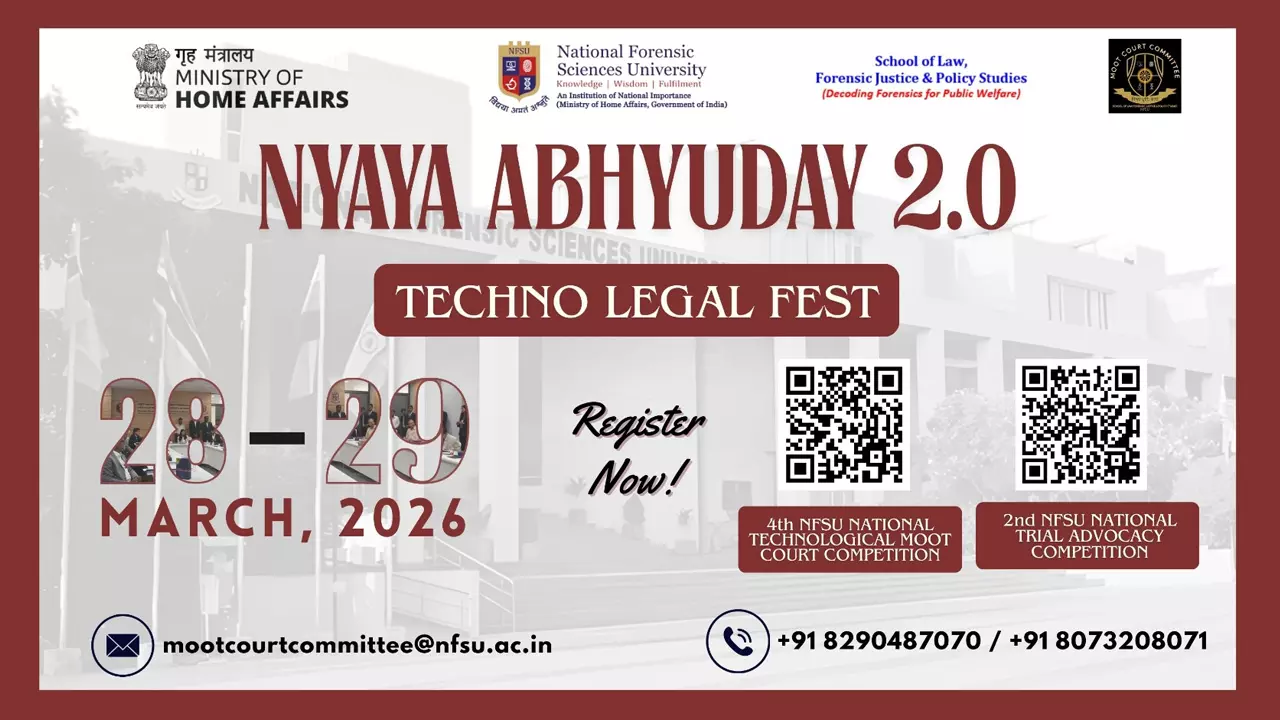 · It is a privilege to announce that SLFJPS, NFSU is organizing Nyaya Abhyuday 2.0 – The Techno-Legal Fest 2026 from 28th to 29th March 2026 at the National Forensic Sciences University, Gandhinagar Campus, Gujarat, in Physical Mode.