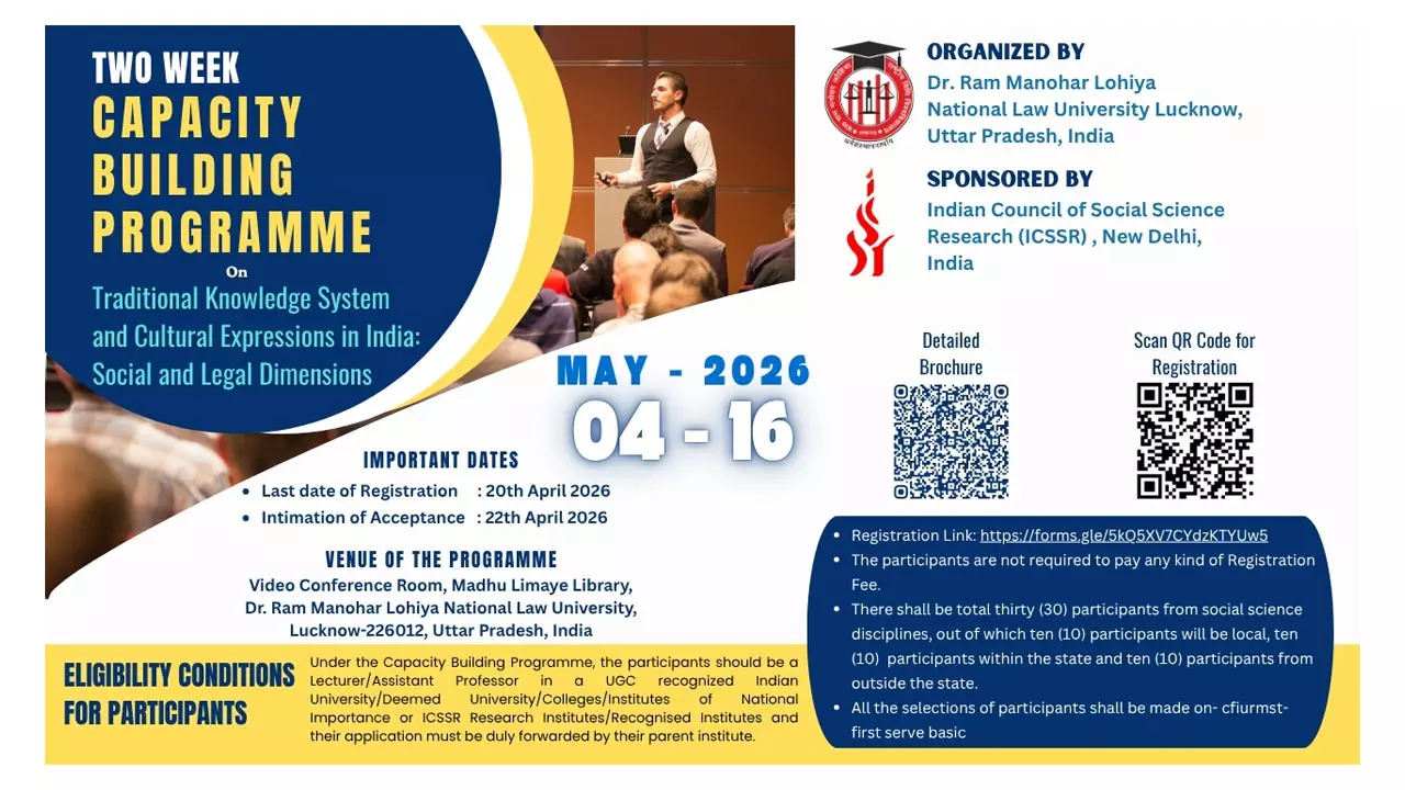 Dr. Ram Manohar Lohiya National Law University (RMLNLU), Lucknow, is organising a Two-Week Capacity Building Programme on “Traditional Knowledge System and Cultural Expressions in India: Social and Legal Dimensions” from May 04–16, 2026. The programme is sponsored by the Indian Council of Social Science Research (ICSSR), New Delhi, and will be conducted in offline mode.