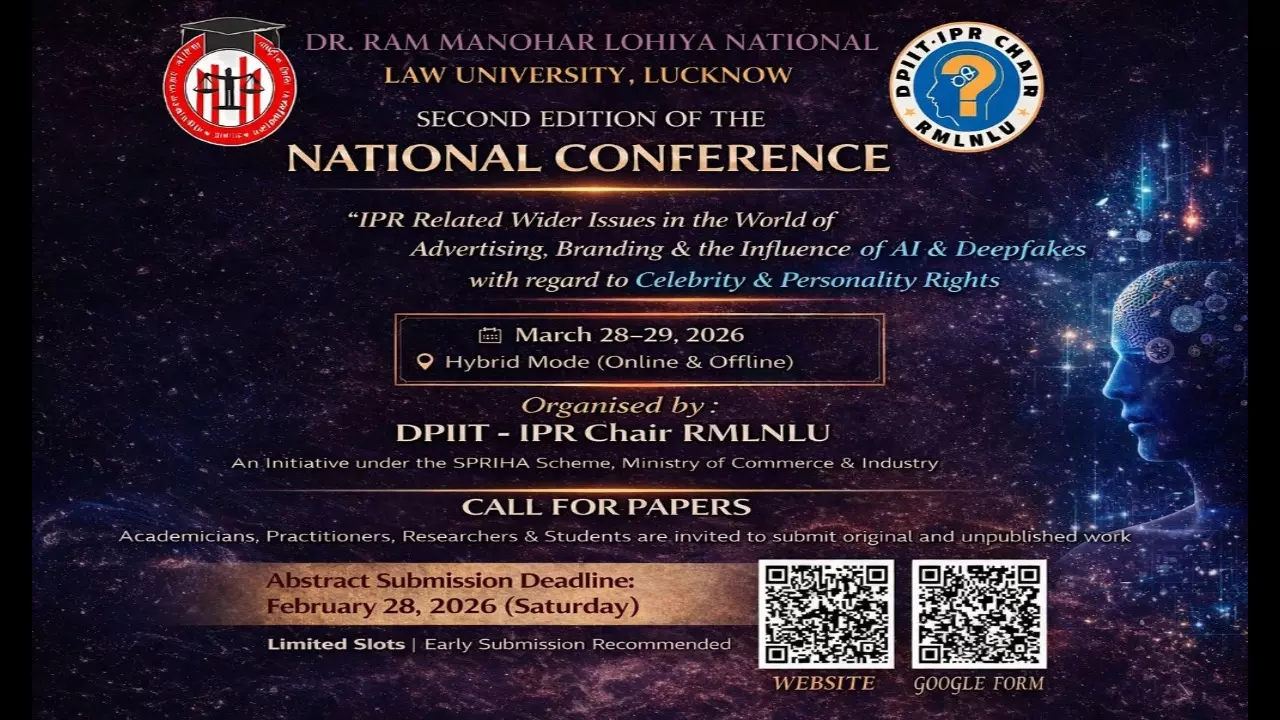 The DPIIT IPR Chair at Dr. Ram Manohar Lohiya National Law University (RMLNLU), Lucknow, is organising the Second Edition of the National Conference on “IPR Related Wider Issues in the World of Advertising, Branding and the Influence of AI & Deepfakes with Regard to Celebrity and Personality Rights” on 28–29 March 2026. The conference will be conducted in hybrid mode, allowing participation both online and offline.