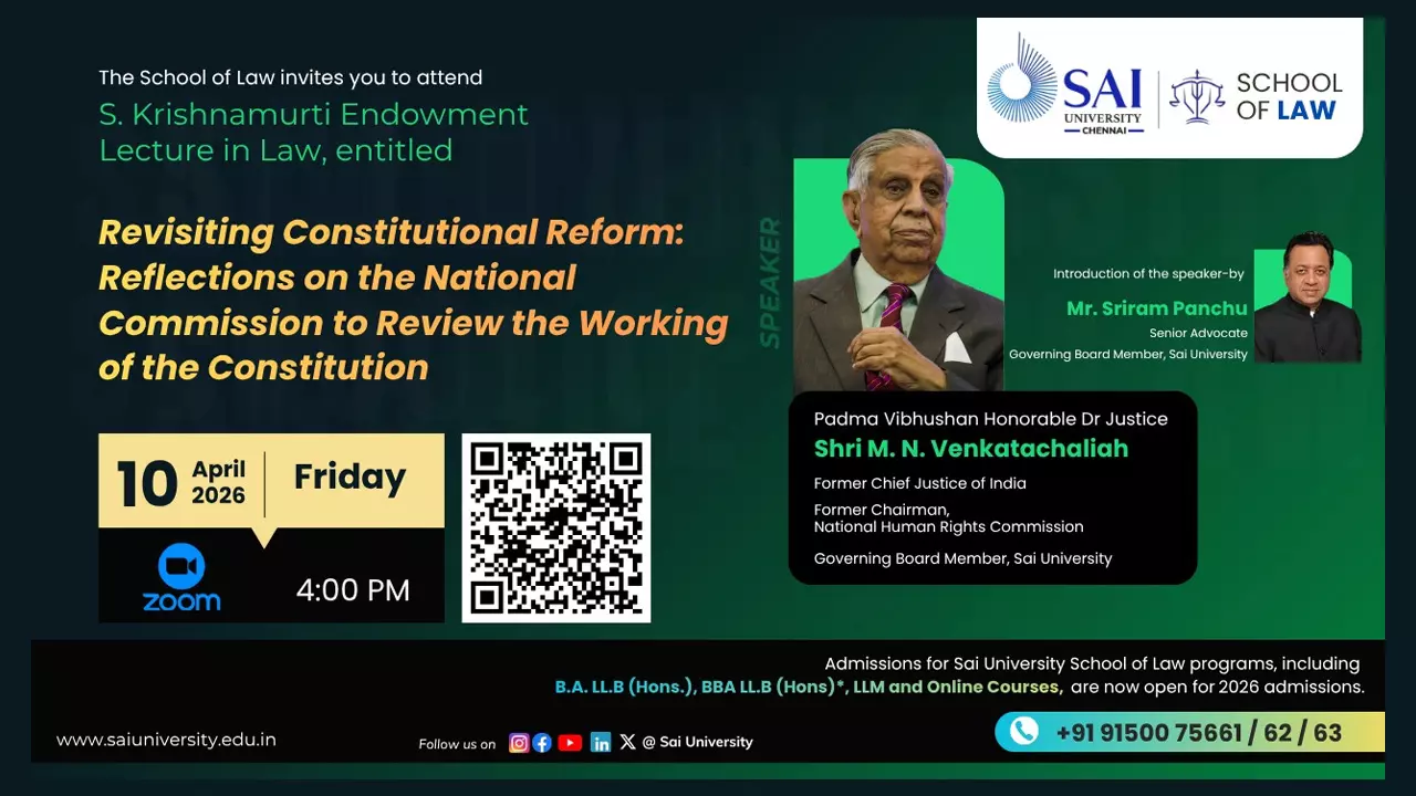 Sai University's School of Law invites you to a distinguished lecture in law featuring eminent jurist Justice M.N. Venkatachaliah, Former Chief Justice of India, as part of the prestigious S. Krishnamurti Endowment Lecture Series.