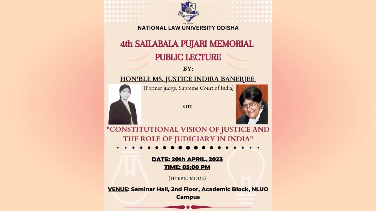 National Law University Odisha is organizing the 4th Sailabala Pujari Memorial Public Lecture on Constitutional Vision of Justice and Role of Judiciary in India. The lecture will be delivered by Justice (Retd.) Indira Banerjee, Former Judge, Supreme Court of India.