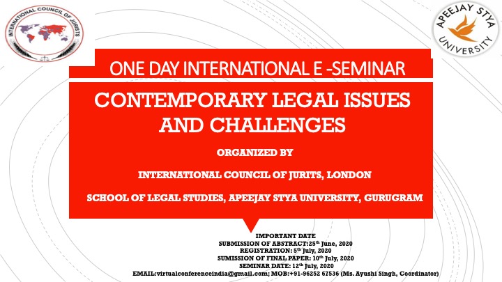 International Council of Jurists, London School of Legal Studies, Apeejay Stya University, Gurugram is organizing a one-day international e-seminar on Contemporary Legal Issues and Challenges.
