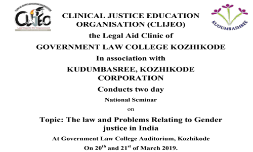 Clinical Justice Education Organisation (CLIJEO) The Legal Aid Clinic of Government Law College Kozhikode In Association with Kudumbasree, Kozhikode Corporation Conducts two-day national seminar on "The Law and Problems relating to Gender Justice in India".