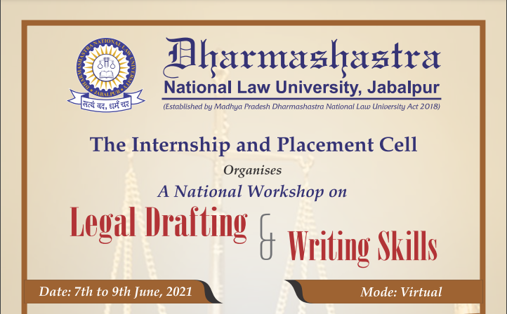 The Internship and Placement Cell of DNLU Jabalpur is organizing a three day National Workshop on "Legal Drafting and Writing Skills" from 7th June to 9th June 2021 virtually.