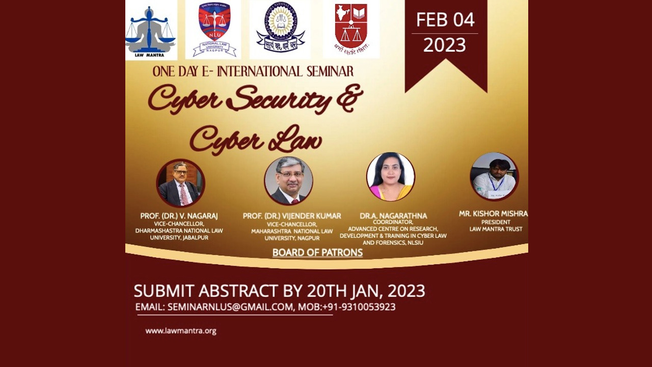 One Day E- International Seminar On Cyber Security & Cyber Laws, Date: 4th February 2023 organized by Law Mantra Trust, Maharashtra National Law University, Nagpur, Dharmashastra National Law University, Jabalpur, Advanced Centre On Research, Development & Training In Cyber Law And Forensics, National Law School Of India University, Bangalore