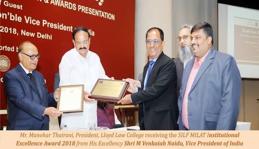 Lloyd Law College, Greater Noida, has been awarded the Institutional Excellence Award 2018. Vice-President M Venkaiah Naidu handed over the award to Lloyd President Manohar Thairani at the 10th Law Teacher’s Day ceremony in New Delhi recently. The award ceremony was graced by Chief Justice of India Deepak Misra.