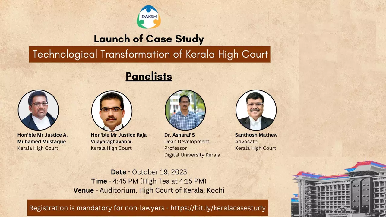 Bengaluru-based think tank and research institution DAKSH is set to launch its seminal case study on 'Technological Transformation of Kerala High Court' on October 19, 2023, at the High Court Auditorium. The study shall shed light on how the Kerala High Court embraced technology to modernize its justice delivery platform and keep abreast with the changing times.The Panelists for the event...