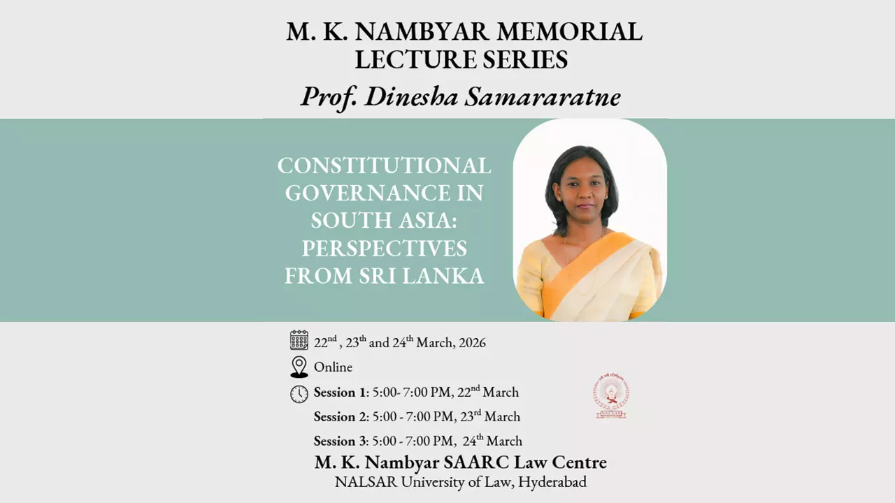 The M.K. Nambyar SAARC Law Centre for Advanced Legal Studies at NALSAR University of Law, Hyderabad, has announced the M.K. Nambyar Memorial Lecture Series 2026, to be delivered by Prof. (Dr.) Dinesha Samararatne, Professor at the Faculty of Law, University of Colombo, Sri Lanka.