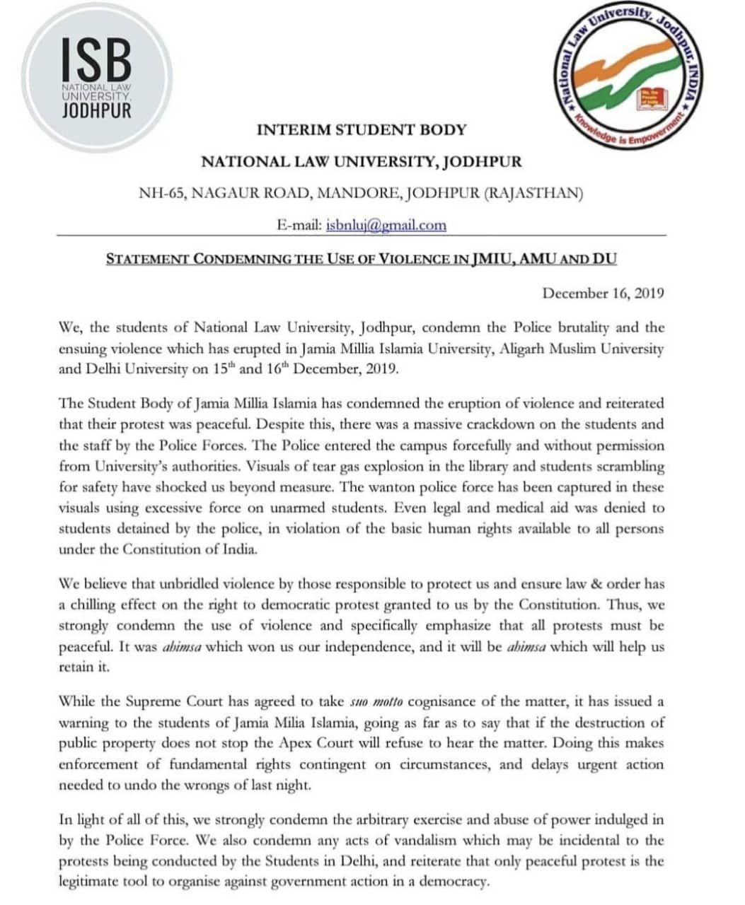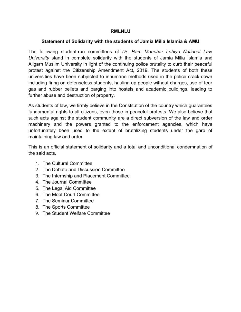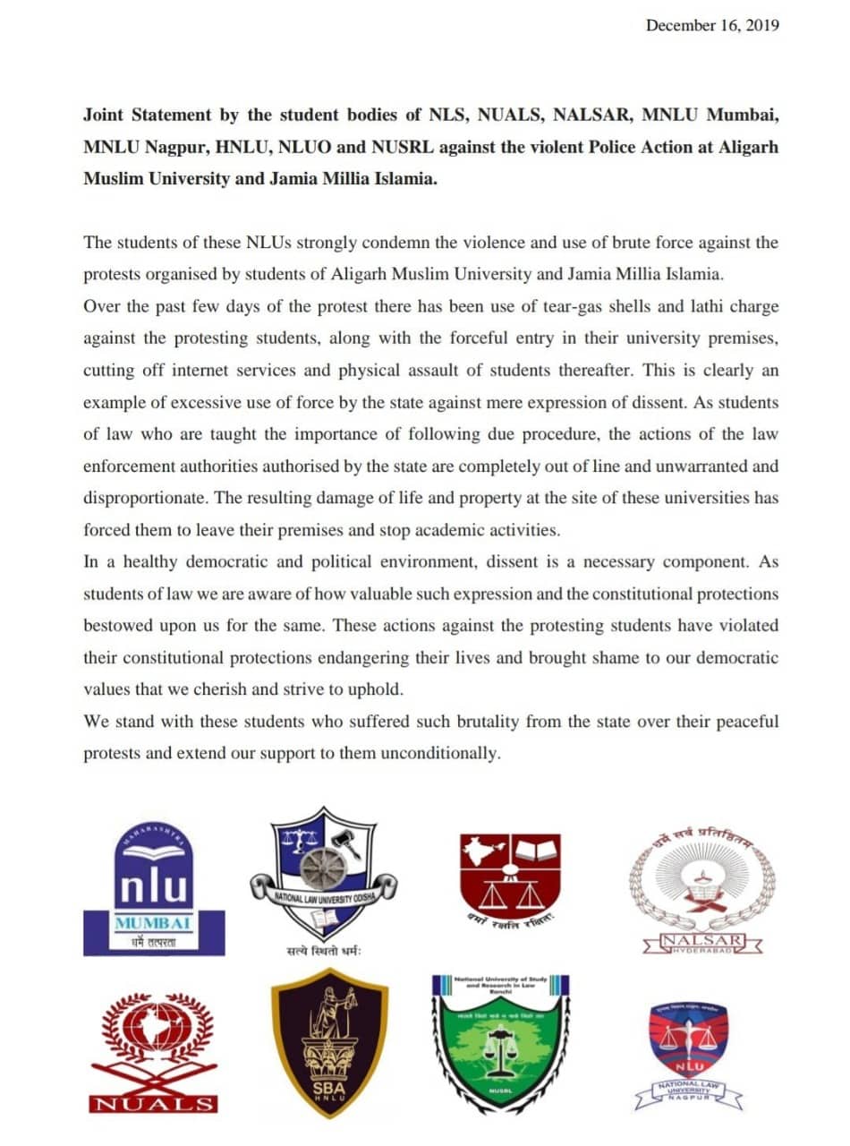 On Monday, a joint statement was issued by the student bodies of NLS, NUALS, NALSAR, MNLU Mumbai, MNLU Nagpur, NLUO, HNLU and NUSRL expressing solidarity with the students of Jamia Milia Islamia (JMI), Aligarh Muslim University (AMU), Jawaharlal Nehru University (JNU), and the Arts Faculty of Delhi University (DU). Similar statements were issued by the Student Council of NLUD, NLUJ and...