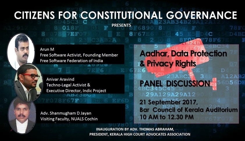 “Citizens for Constitutional Governance “ , a Kochi-based collective of person from the fields of law, technology, academics etc, will hold an interactive panel discussion on Aadhaar, Data Protection and Privacy Rights at 10 AM on 21.09.2017(Thursday) at Bar Council of Kerala Auditorium , Ernakulam. Panelists are Mr. Anivar Aravind, a techno-legal activist and Executive Director of...