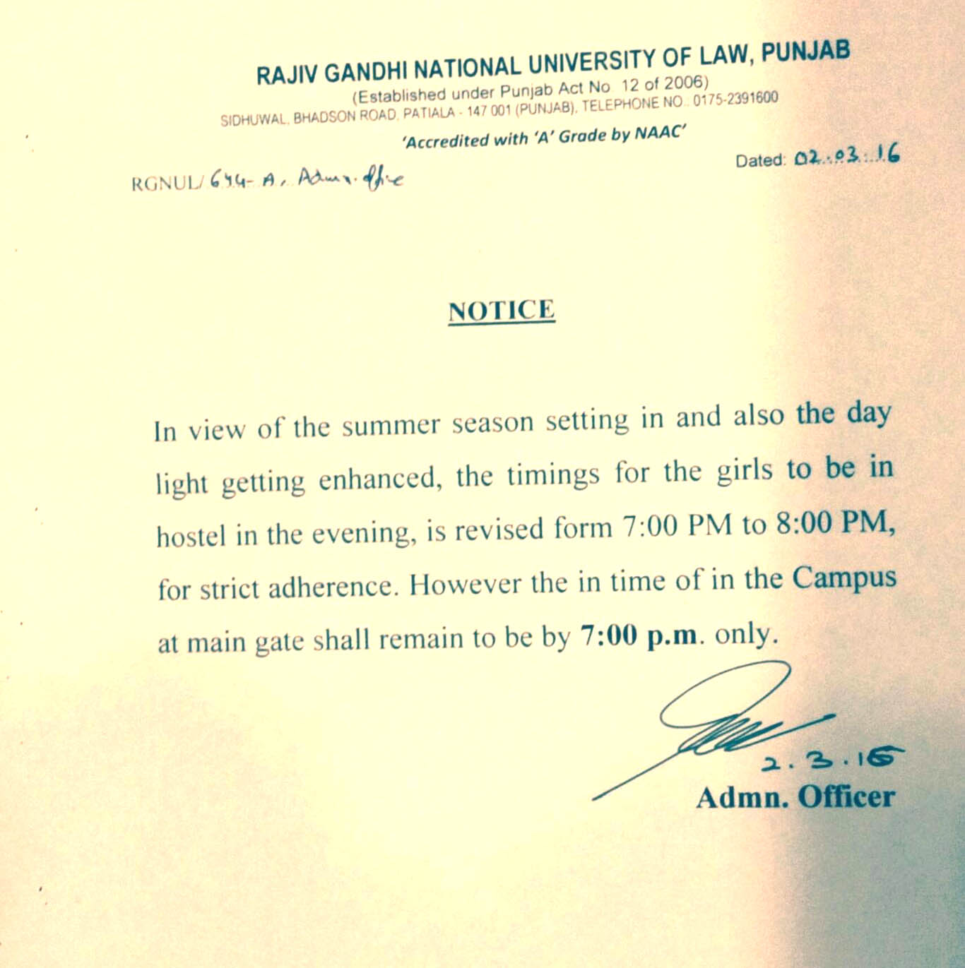 However, an earlier Notice issued by the administration of RGNUL, Patiala had stated, “According to the aforementioned Notice dated 02-03-2016, the curfew timings for the girls to be in hostel in the evening, is revised from 7:00 PM to 8:00 PM, for strict adherence. However, the in time of Campus at main gate shall remain to be by 7:00 PM only,” The Notice can be accessed here.”