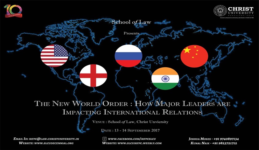 The Seminar on ‘The New World Order: How Major Leaders Are Impacting International Relations’, a student-led initiative is proposed to be held on the 13th and 14th of September, 2017 as a part of the Decennial celebrations of School of Law Christ University which shall be organised by the International Relations & Foreign Policy Committee.