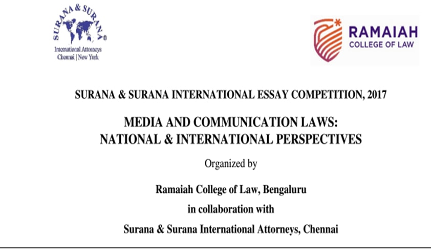 Surana & Surana International Essay Competition, 2017 to be organized by Ramaiah College of Law, Bengaluru in collaboration with Surana & Surana International Attorneys, Chennai.