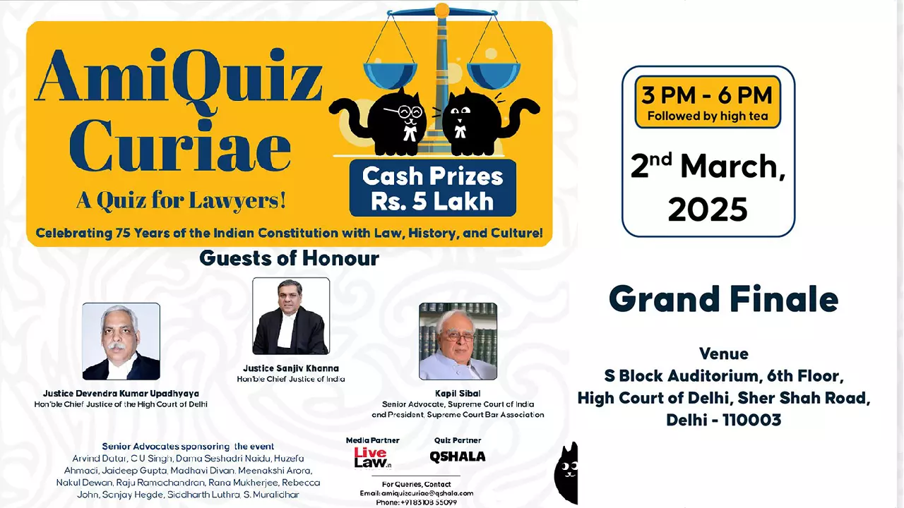 The Grand Finale of the AmiQuiz Curiae National Legal Quiz will be held in New Delhi on March 2, 2025. The quiz is a tribute to the 75th anniversary of the Indian Constitution.Finalists from the North, East, West and South Zonal rounds will be competing in the finals. Justice Sanjiv Khanna, Chief Justice of India; Justice DK Upadhyaya, Chief Justice of the Delhi High Court; and Senior...