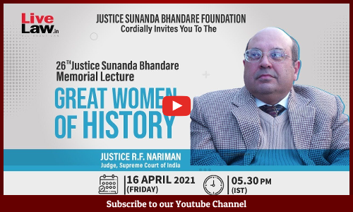 Justice RF Nariman of the Supreme Court of India will be speaking on the theme "Great Women of History" on the occasion of the 26th Justice Sunanda Bhandare Memorial Lecture today at 5. 30 PM.The event will be live-streamed here. About Justice Sunanda Bhandare Born on November 1, 1942, the year of the quit India movement, Sunanda was freedom's child. Later, much later, she...