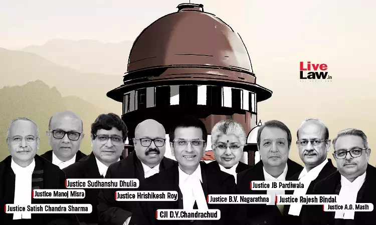 The matter is being heard by a bench of Chief Justice of India DY Chandrachud, Justices Hrishikesh Roy, B.V. Nagarathna, Sudhanshu Dhulia, J.B. Pardiwala, Manoj Misra, Rajesh Bindal, Satish Chandra Sharma and Augustine George Masih.