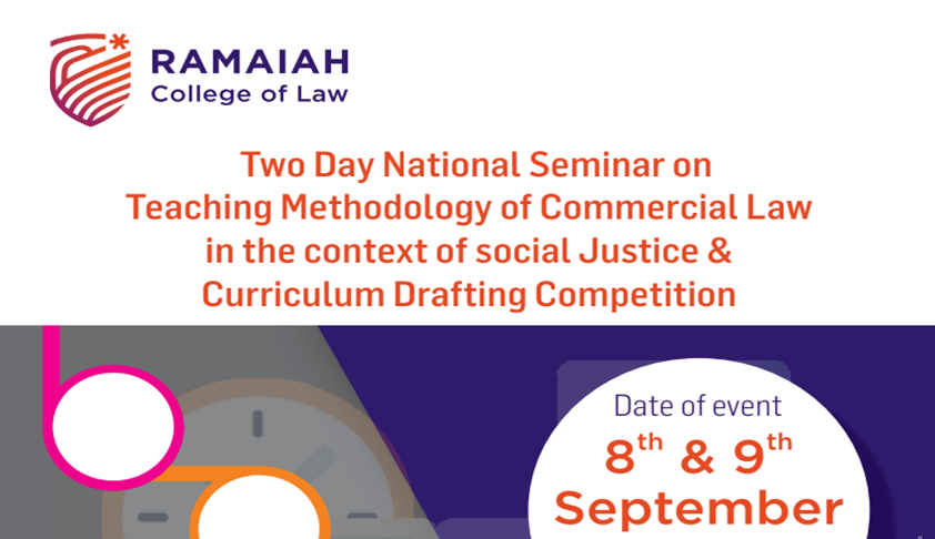 Ramaiah College of Law is organising Two Day National Seminar on Teaching Methodology of Commercial Law in the context of social Justice & Curriculum Drafting Competition from 8th - 9th September 2018.