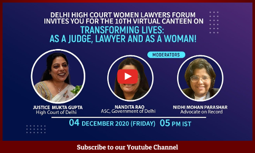 Delhi High Court Women Lawyers Forum is organizing a Webinar On Transforming Lives: As a Judge, Lawyer And As A Woman.Date and Time: December 4, 2020 5PMSpeaker: Justice Mukta Gupta, High Court of DelhiModeratorsNandita Rao, ASC Government of DelhiNidhi Mohan Parashar, Advocate on RecordZoom Link: https://us02web.zoom.us/meeting/register/tZwtcu6tpjIoE9xZ-IZf5dYD79YAM21G3rmb After registering,...